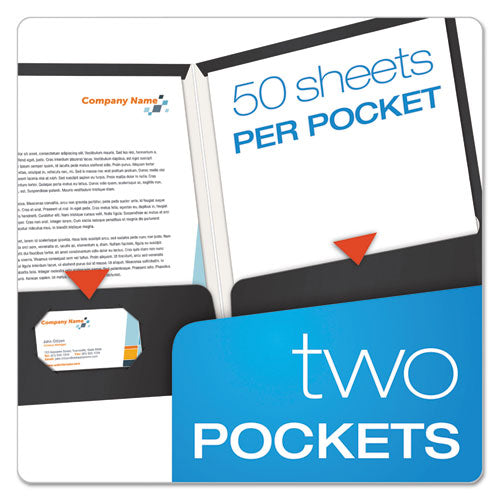 Bright, laminated high-gloss covers get attention. Die-cut business card holder on inside front cover keeps contact information at hand. For 11 x 8.5 sheets. Holds up to 100 sheets (50 per pocket). Front Cover Color(s): Black; Color Family: Black; Back Cover Color(s): Black; Sheet Size: 11 x 8.5.