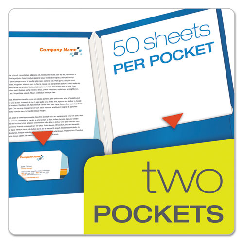 Bright, laminated high-gloss covers get attention. Die-cut business card holder on inside front cover keeps contact information at hand. For 11 x 8.5 sheets. Holds up to 100 sheets (50 per pocket). Front Cover Color(s): Blue; Color Family: Blue; Back Cover Color(s): Blue; Sheet Size: 11 x 8.5.