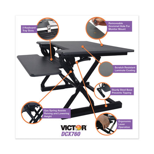 Transforms any standard sit-down desk into a sitting or standing desk. It sits on top of your current desk or table and does not require clamping or attachment of any kind. Simply go from sitting to standing with an easy squeeze of the lever handles on each side of the work surface. Perfect for any environment, it can be used in the home, professional office or industrial work places. The large, deep desk surface is accompanied by a wide and deep keyboard tray. Provides an ergonomic working position for users of varied heights. Gas spring system allows for smooth and stable height adjustment. Sleek wood construction and durable, scratch-resistant laminate coating will provide years of use with a modern style. Through-hole at rear of upper work surface accommodates monitor mount. Clamp-style monitor mounts can also be used, as the metal frame does not interfere with attachment and placement. Monitor mount sold separately. Worksurface/Base Color: Gray/Black; Color Family: Gray; Worksurface Shape: Rectangular; Worksurface Material: Wood.