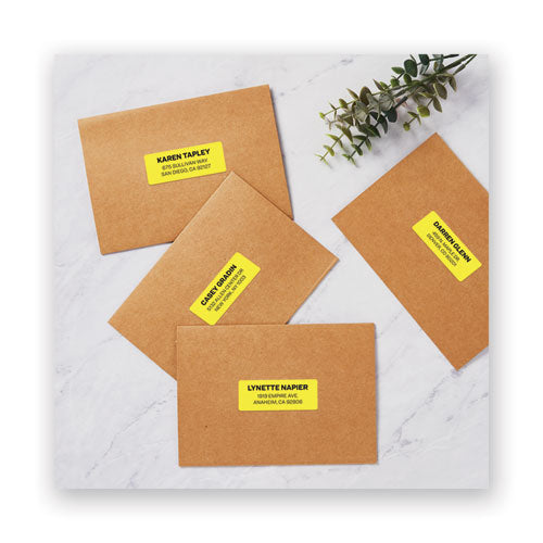Have something important to say? Customize your white labels with attention-getting images or make your most important messages stand out with high-visibility color labels. Ideal for announcements, priority messages, addressing, color-coding, identification/warning labels and more! Easy to customize with free templates from Avery® Design & Print. For laser printers. Now you've got their attention. Laser Permanent Neon Rectangular Labels with Sure Feed™—Ensuring a reliable printer feed. Shape: Rectangular; Label Size - text: 1 x 2.63; Label Color(s): Neon Yellow; Color Family: Yellow.