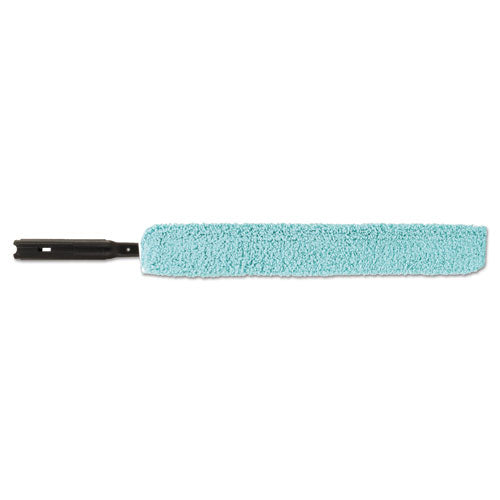 The Rubbermaid Commercial Products HYGEN Quick-Connect Flexible Duster Wand with Microfiber Sleeve reaches into narrow, hard-to-reach spaces to effectively remove dust, dirt, and grime. The flexible microfiber duster wand bends to conform to irregular surfaces. The binding on the best duster wand provides easy threading of dusting sleeve. Quick-Connect handle converts hand duster to an extended-reach cleaning tool. These dusters are designed to be used hand-held or with Rubbermaid HYGEN Quick-Connect handles and extension poles to extend reach. Bristle Color: Green; Handle Material: Plastic; Handle Color: Black/Gray; Handle Length: 28.75".