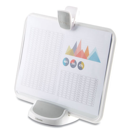 Innovative 3-in-1 design: document holder, dry-erase board and clipboard. Places documents in a more comfortable viewing position to help reduce neck, shoulder and eye strain. Allows portrait and landscape orientation. Dry erase board for quick notes or reminders, while copy clip holds up to 100 sheets of letter-sized paper. Holds: Letter; Mounting: Free Standing; Material(s): ABS Plastic, High Impact Polystyrene; Sheet Capacity: 100.