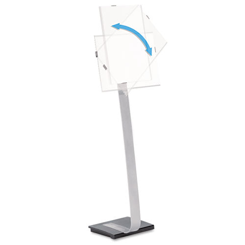 Patented mechanism allows effortless rotation from portrait to landscape orientation. Anti-glare, crystal clear front panel removes in seconds for quick insertion of sheets. High-quality aluminum floor stand has a rugged cast iron base with rubber pads for stability. Can also be used with DURABLE Literature Dispensers (sold separately). Frame Color: Clear; Size: 15 x 50; Insert Size: 11 x 17; Material(s): Alumnium/Acrylic/Cast Iron Base.