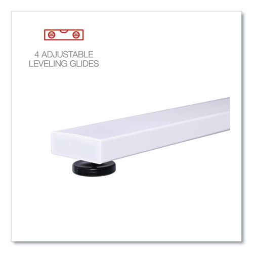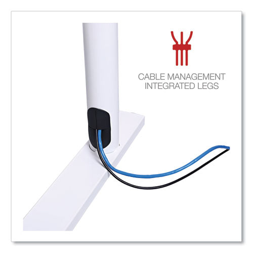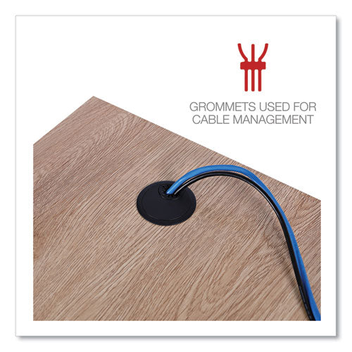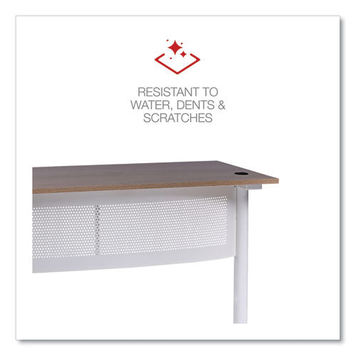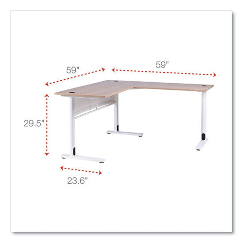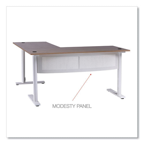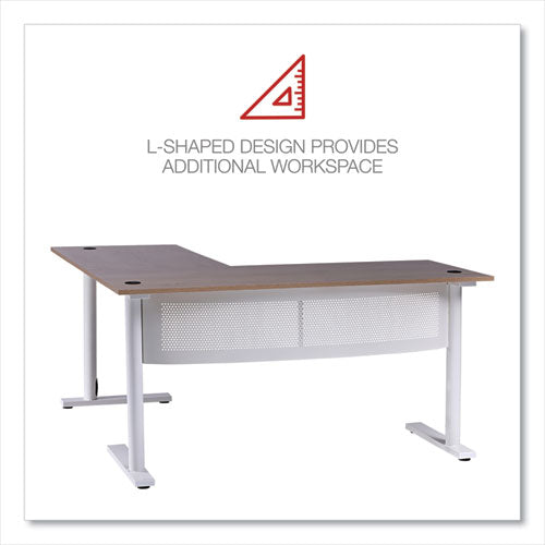 Delivering the best of both worlds, this Workspace by Alera® L-shaped computer desk is both spacious and compact. The large desktop accommodates everything you need to be productive and has room to spare for displaying decorative items. The L shape is compact in footprint when placed in a corner but is finished on all sides so you can position it however you choose in a home office. Built-in cable management through legs allows for a cleaner look. Attached modesty panel for privacy if used in an office environment. The laminate wood desktop panel and metal base are sleek yet sturdy, giving this desk a modern simplicity that coordinates with most decors.