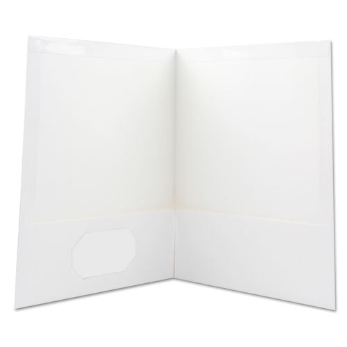 Convenient, laminated two-pocket folder is the complete solution for business presentations, keeping all of your documents neat and organized. Laminated high-gloss covers are durable and easy to wipe clean. Die-cut business card holder on the inside keeps contact information easily accessible. Generous capacity of up to 100 sheets per folder. Front Cover Color(s): White; Color Family: White; Back Cover Color(s): White; Sheet Size: 11 x 8.5.