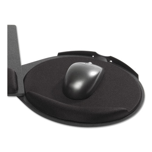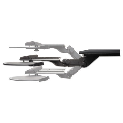 Leverless arm with height adjustable indicator gauge. Easy to view tilt dial with soft touch adjustment knob. 10 degree positive/15 degrees negative tilt. Soft to touch Viscoflex™ memory foam wrist support and pad with Aegis™ antimicrobial product protection. Lift n Lock feature with eight inch vertical height range. Low profile design for optimal leg clearance. Color: Black; Capacity (Weight): 10 lbs.; Workstation Type: 90° Corner; Curved; Diagonal; Straight; Height (+/- Desktop): +2"/-6".