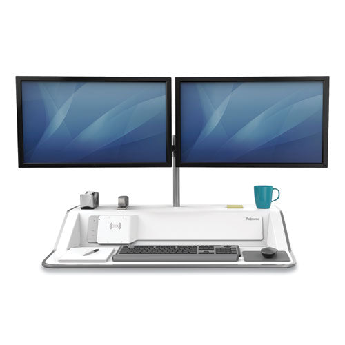 Built-in charging station with wireless charging stand that makes staying productive effortless. Patent-pending Smooth Lift Technology™ keeps your workstation stable and makes changing positions effortless. Contains Microban® antimicrobial technology for powerful, continuous product protection against bacteria. Features 22 different height settings and 17” of vertical adjustment so you can work in a position that’s perfect for you. Innovative cord management with rear USB ports for your keyboard and mouse allows your entire workspace to move freely with you. Integrated 2-port USB charging station also features wireless charging for Qi-enabled devices. Arrives fully assembled—no complicated instructions, no mounting, just unpack and get started. Holds up to 35 lbs. Compatible with Fellowes® Lotus™ Monitor Arm Kits-not included. Worksurface/Base Color: White; Color Family: White; Worksurface Material: Plastic; Base Material: Plastic; Steel.
