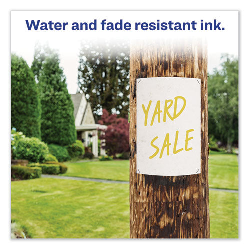 Won't dry out – leave cap off up to 1/2 hour! Bold marking, permanent ink provides high visibility. Marks on virtually any surface, including cardboard, metal, and plastic. Quick drying; water and rub resistant. Durable chisel tip marks in a variety of widths. Low odor. Safe for office, school, or home. Marker Ink Type: Permanent; Marker Tip Type: Chisel; Marker Tip Size (text): Broad; Marker Tip Size (numeric): 4.8 mm.