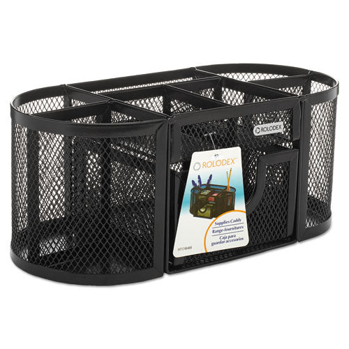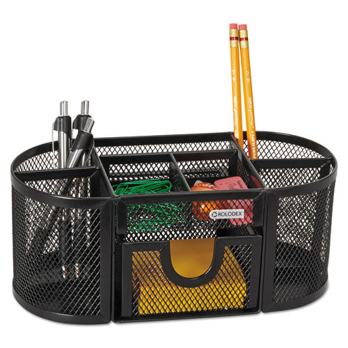 Keep your desk neat and organized with the Rolodex Mesh Collection Oval Pencil Cup. With divided compartments for pencils, pens, paperclips, rubber bands, and a drawer for 3-inch by 3-inch notepads, this oval pencil cup helps keep even the busiest workspaces orderly. Desktop Supplies Organizer Type: Multipurpose; Number of Compartments: 4; Overall Width: 9.38"; Overall Depth: 4.5".