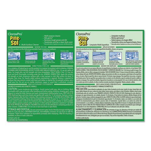 With Pine-Sol All Purpose Multi-Surface Cleaner, you only need one cleaner to fight dirt, grime and grease, while EPA registered to disinfect and kill 99% of germs on most surfaces throughout your home or office. Pine-Sol gives you 4X cleaning action. It deodorizes and wipes out odor causing bacteria leaving a great, long lasting scent. This concentrated formula cleaner can tackle any challenge, just mix Pine-Sol Cleaner with water at different strengths to adjust your cleaning power each time, unlike premixed cleaners. Pine-Sol is safe to use on most hard non-porous surfaces including finished hardwood, ceramic tile, linoleum, plastic, and leaves no sticky residue. Pine-Sol can also be used to freshen laundry. With the power of Pine-Sol on your side, you only have to clean once to get the job done right. Ideal for use in schools, daycare centers, restaurants, hotels and other commercial facilities. Packaging may vary. Application: Disinfectant/Cleaner; Applicable Material: Ceramics; Enamel; Fiberglass; Finished/Sealed Wood; Laminates; Metal; Plastic; Sealed/Engineered Stone; Vinyl; Dirt Types: Bacteria; Dust; Fungus; Germs; Grease; Grime; Mildew; Mold; Viruses; Water-Based Soil; Scent: Pine.
