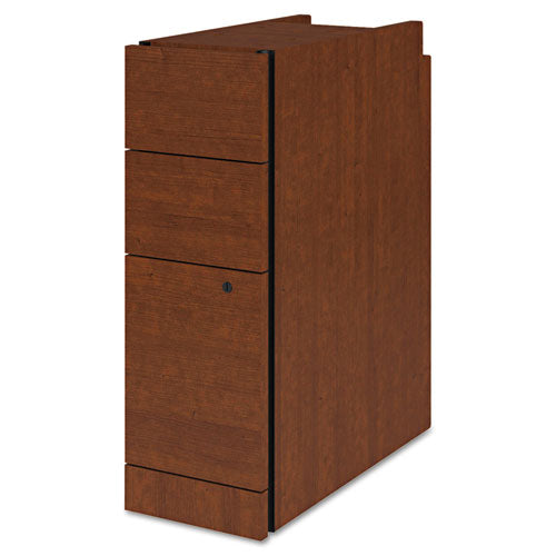 Not freestanding; designed for use under 24"-36" deep 10500/10700 Series shells. Durable, scratch-resistant laminate surfaces. File drawer extends fully and features integrated hang rails for letter- or legal-size files; box drawers extend 75%. Steel ball bearing suspension for smooth operation. Lock controls middle box drawer and file drawer; top box drawer does not lock. Box/Box/File. Color: Cognac; Color Family: Cherry; Overall Width: 9.5"; Overall Depth: 22.75".