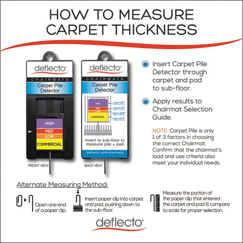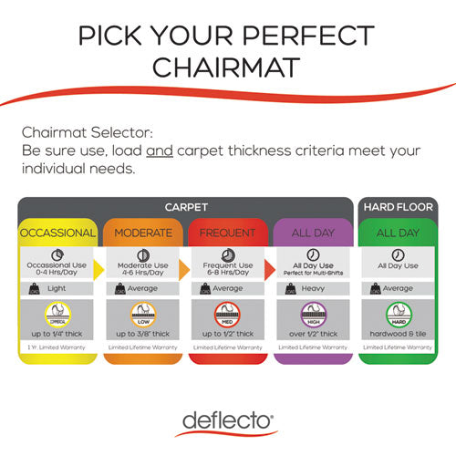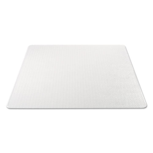 Thinner mat provides a great value while offering economical performance. Lightweight chair mat for occasional use on carpets up to 1/4" thick. Easy-glide rolling surface provides effortless chair movement. Studded design secures mat from moving while protecting carpet from caster wear, spills and heavy traffic. Free and Clear® non-orthophthalate, non-cadmium formula promotes a healthy work environment while offering exceptional clarity and durability. Classic straight edge finish. Mat Type: Chair Mat; Application: Carpets; Width: 46"; Length: 60".