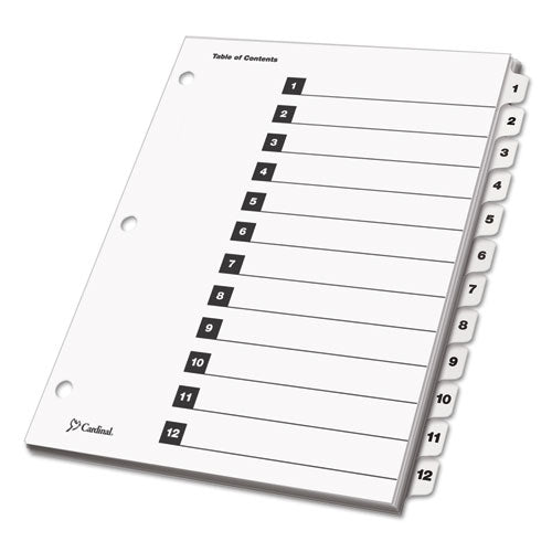 Cardinal® OneStep® Table of Contents Dividers help you create an index system instantly. Matching, preprinted tabs on the divider sheets can be used in either vertical or landscape formats. Tab sets have coordinating Table of Content sheets. Easy to use, free templates in your favorite software are available online; details on packaging. Tabs and ring edges are reinforced to withstand heavy use. Laser and inkjet compatible. Three-hole punched and sized for 8.5" x 11" sheets. Index Divider Style: Arabic Numeric; Index Divider Size: 11 x 8.5; Punched/Unpunched: 3-Hole Punched; For Use With: Ring Binders.