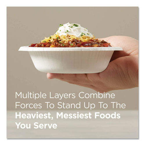Unique multilayer design with Soak Proof Shield® is great for cut-, moisture- and grease- resistant performance. Shaped for greater holding power, it carries the load of almost any food type. Go from the microwave to table with ease. Dinnerware Type: Bowl; Material(s): Paper; Capacity (Volume): 12 oz; Diameter: 5.8".