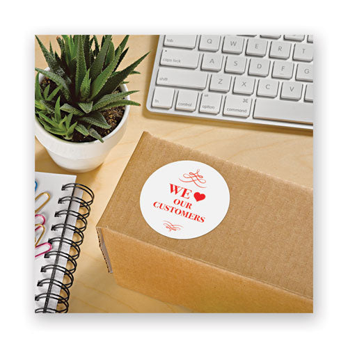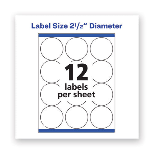 Have something important to say? Customize your white labels with attention-getting images or make your most important messages stand out with high-visibility color labels. Ideal for announcements, priority messages, addressing, color-coding, identification/warning labels and more! Easy to customize with free templates from Avery® Design & Print. For laser printers. Now you've got their attention. Laser Permanent White Round Labels with Sure Feed™—Ensuring a reliable printer feed. Shape: Round; Label Size - text: 2.5" dia.; Label Color(s): White; Color Family: White.
