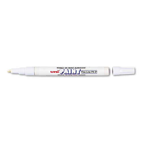 Create long-lasting artwork with uni Paint Markers. These permanent paint markers can be used on glass, metal, stone, plastic, wood, and other surfaces. The oil-based formula is glossy and opaque, and produces bold marks. Marker Ink Type: Permanent; Marker Tip Type: Bullet; Marker Tip Size (text): Fine; Marker Color(s): White.