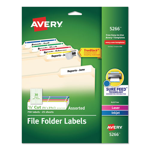 This is the mark of a true professional. Use these file folder labels with TrueBlock® technology to give ordinary folders a clean, organized look that's easy to identify. These innovative labels are designed to completely cover everything underneath, from markings to old, existing labels. Plus, these labels are guaranteed to stick and stay, without curling or lifting. And with free templates from Avery® Design & Print you can put smart label design in plain view, or add your own custom colors to create your own filing system. Simply type in text to identify folders or documents. After printing, you'll have professional-looking labels that you can spot right away. 8 1/2" x 11" sheets for laser and inkjet printers. Shape: Rectangular; Label Size - text: 0.66 x 3.44; Label Color(s): White; Color Family: White.