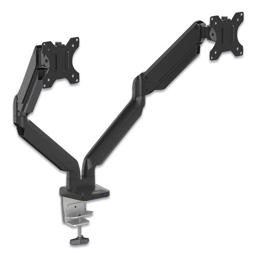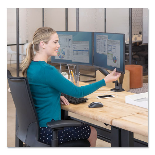Two fully independent adjustable monitor arms with innovative gas spring technology allows for effortless monitor adjustment. Intuitive cord management system helps minimize clutter. Two 3.0 USB ports located at the base of the product make it easy to connect to your favorite devices. Easy to mount – can be mounted via clamp on desks between 0.8" and 4.7" thick or grommet hole between 0.3" and 2.9". Each arm holds a monitor up to 20 lbs. OEM/Compatible: Compatible; Workstation Type: Traditional Desk/Table; Series Name: Fellowes® Platinum Series; Width (Max): 33.5".