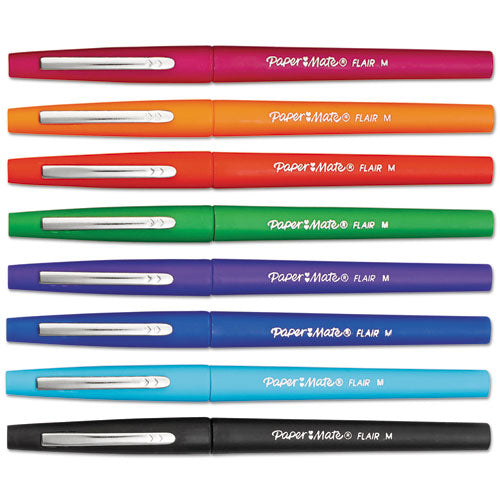 Add bright, vivid details to your writing and drawing with Paper Mate Flair Felt Tip Pens. Featuring a comfortable barrel grip and high-quality water-based inks, these pens are compatible with most surfaces and won’t bleed through paper. These pens feature point guards that prevent the tips from fraying and drying out to keep your pen fresh. Every stroke produces bold, clean lines that are perfect for drawing, editing documents and checking papers. Pen Sub-Brand & SKU Line: Point Guard® Flair®; Pen Style: Stick; Pen Type: Porous Point Pen; Refillable (Yes/No): No.