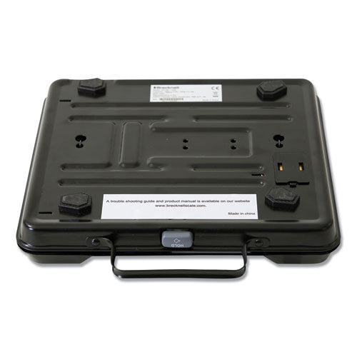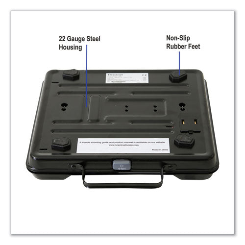 Portable bench scale which is designed for greater accuracy with attached handle. Weight hold key locks weight reading when a larger package blocks the display. Internal backlit display with four 1" high LCD digits for easy visibility. Discreet keyboard technology. Electro-mechanic design. 22-gauge steel base. Auto-zero tracking and manual zero return. Programmable auto-shut-down. Scale Type: Utility/Freight; Electronic/Mechanical: Electronic; Increments: 0.1 kg; 0.2 lb; Power Source(s): AC Adapter (Sold Separately) or 9V Battery (Included).