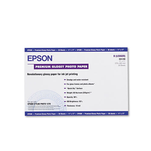 Exhibition-grade fiber paper provides professional-level photo and digital graphic printing. An extremely wide spectral gamut facilitates vivid, tone-matched color reproduction. Enhanced 2880 dpi resolution ensures crisp, photo-lab-quality results. Outstanding dMax (density maximum) rating enables true-to-life imaging contrast and saturation. Two-layer polyethylene resin coating improves dimensional stability and ensures cockle-free, instant post-print drying. Sheet/Roll Size: 11 x 17; Paper/Media Thickness (mil): 10.4 mil; Paper/Media Color(s): White; Color Family: White.