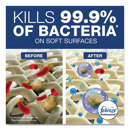 Soft surfaces that can’t be washed, such as mattresses and upholstered furniture, are harbors for harmful bacteria, mold and mildew. Febreze Professional Sanitizing Fabric Refresher gives you the same freshening power of Febreze plus the soft surface sanitization your environment needs. Proprietary technology goes to the source of odors and eliminates them. A light, fresh scent is left behind to leave the treated area smelling fresh and clean. Safe for virtually all fabrics. Spray soft surface until fully wet and the soft surface must remain wet for five minutes.