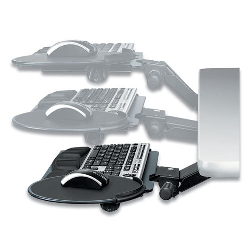 Work "sitting" or "standing". Height can be adjusted for taller users (up to 6 1/4" above desktop) and the range of motion below desk is 5" for custom knee clearance. A simple one-handed motion instantly repositions keyboards height without locks or levers. The 10" round mousing platform mounts over your keypad or flush with keyboard. Leatherette keyboard palm support with Microban® antimicrobial product protection keeps product cleaner. Color: Black; Workstation Type: Curved; Diagonal; Straight; Height (+/- Desktop): +6 1/4"/-5"; Keyboard Tray Dimensions (W x D): 19" x 10.63".