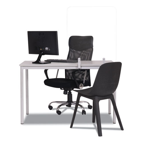 Due to the COVID-19 pandemic, social distancing and personal protection have become the new norm in order to stay safe. MasterVision introduces to you the Protector Series, designed specifically to protect you in public spaces. The Protector Frameless Glass Desktop Divider is an important tool that helps users maintain contact while still being protected. Ideal for shared office spaces and other public settings. Extremely easy to clean and sanitize. Features a pair of robust clamps which attach to the tabletop or desktop. Color: Clear/Aluminum; Overall Width: 55.1"; Overall Depth: 0.16"; Overall Height: 35.4".