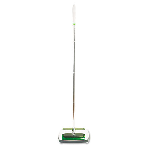 Nothing to plug in and no refills to buy. With a 7 1/2" cleaning path, the quick floor sweeper is a great way to sweep up large and small debris from hard surface floors and low pile carpets. Soft rubber blades won't damage floor. Dual debris receptacles unload from top for easy cleanout. Rubber bumper around entire sweeper protects walls. Application: Hard Floor; Low Pile Carpet; Bristle Material: Rubber Blades; Bristle Length: 7 1/2"; Handle Material: Metal.