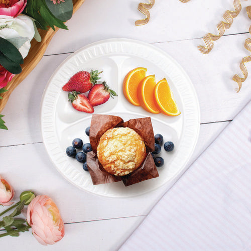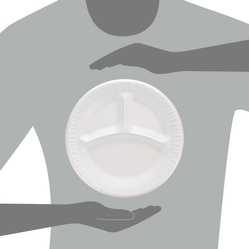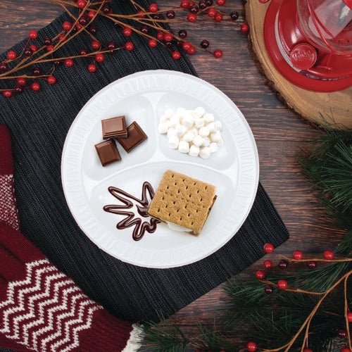 Quiet Classic Laminated Foam Dinnerware, 3 Compartment Plate, 9" Dia, White, 500/carton