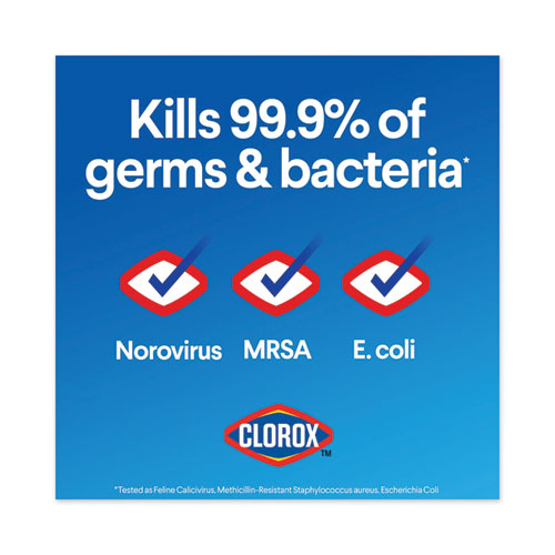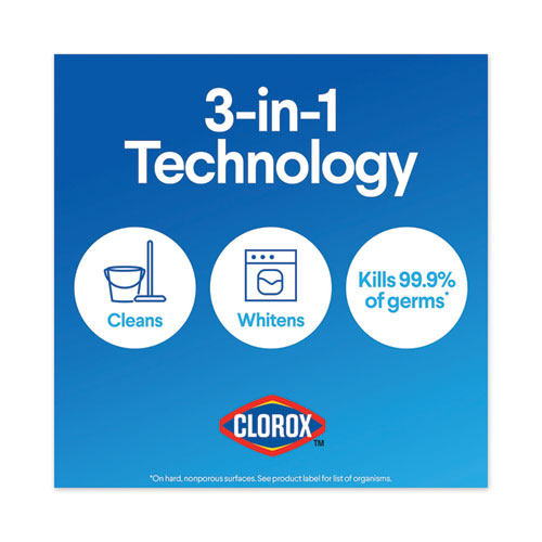 Clorox Disinfecting Bleach with CloroMax kills 99.9% of household germs and bacteria. Cleans, disinfects, deodorizes, whitens and removes stains. Clorox Disinfecting Bleach whitens whites, keeps clothes whiter longer, and removes 70% more stains than detergent alone. Remove tough laundry stains from white clothes including red wine, grass, dirt and blood stains. It is safe to use in standard and HE washers. What's more, Clorox Disinfecting Bleach contains CloroMax Technology to protect household surfaces as it cleans, so stains won't stick and cleanup is easier. Clorox Disinfecting Bleach disinfects and deodorizes surfaces, killing 99.9% of mold and germs, including norovirus, flu virus, MRSA, E. Coli, and Salmonella left on household surfaces such as countertops, floors, toilets and more. Ideal for use in offices, restaurants, and other commercial facilities. Discover the power of clean with Clorox Disinfecting Bleach. Application: Bleach; Applicable Material: Ceramics; Cement/Concrete; Enamel; Fabric; Glass; Laminate; Metal; Plastic; Chemical Compound: Sodium Hypochlorite; Sodium Hydroxide; Dirt Types: Bacteria; Fungus; Germs; Grime; Mildew; Mold; Organic Matter; Soil; Stains.