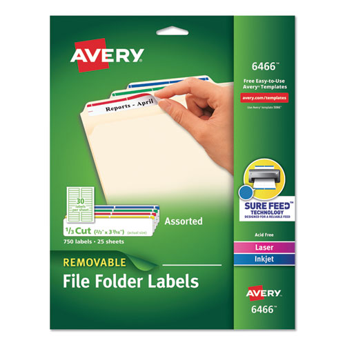 Make quick changes and reuse your file folders with our removable file folder labels. The removable adhesive helps labels stick, stay and remove cleanly when you need a change. Labels feature an eye-catching color strip at the top to make it easier to find just the folder you're looking for. The assorted colors make them great for color coding too. Write by hand or use our free templates from Avery® Design & Print to customize and print your labels for a professional look. For a truly versatile label, it's hard to beat these file folder labels. 1/3 Cut Top Tab—4 x 6 sheets. Shape: Rectangular; Label Size - text: 0.66 x 3.44; Label Color(s): White; Color Family: White.