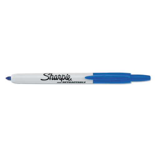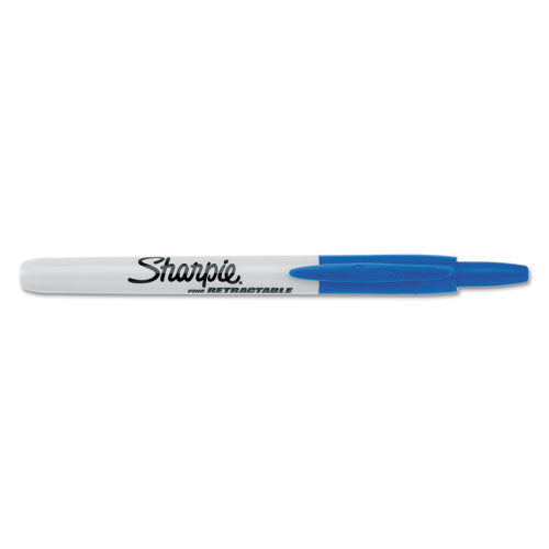 Forget about a cap--just click and create! These markers are easy to use, bold to the max, and permanent to the core, inspiring you to transform ordinary surfaces into passionately creative statements. Made to write practically everywhere, vivid Sharpie markers eliminate dull and boring. Sharpie has iconic ink that dries quickly and resists both water and fading. While pale imitations wither away, Sharpie markers make creations that endure. And these retractable markers have a safety seal valve design that helps prevent the ink from drying out. Featuring a convenient design for one-handed operation with no cap to remove or lose, Retractable Sharpie Permanent Markers make courageous self-expression as easy as can be. Marker Ink Type: Permanent; Marker Tip Type: Bullet; Marker Tip Size (text): Fine; Marker Color(s): Blue.