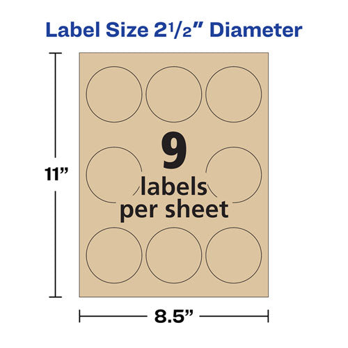 Kraft brown round labels are ideal for branding and promotional applications. Print-to-the-edge feature allows you to extend colors right to the edge of the label to get a customized look. Permanent adhesive tightly bonds to paper, cardboard, corrugated materials and more. In short, these labels are guaranteed to stick and stay. Easy to customize with free templates and designs using Avery Design & Print. Recyclable and made entirely of recycled materials. 8.5" x 11" sheets for laser and inkjet printers. Shape: Round; Label Size - text: 2.5" dia.; Label Color(s): Kraft Brown; Color Family: Brown.