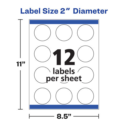 Ideal for merchandising products, labeling gifts, crafts, party favors, jar labels, jam labels and more. Print-to-the-edge feature lets you add bright, bold colors and text all the way to the edge of the label. Permanent adhesive ensures that they stick and stay. Easy to customize with free designs and templates from Avery® Design & Print. These premium round labels are a great way to get your products noticed. Glossy White Labels with Easy Peel®—Simply bend the sheet to expose the label's edge. Shape: Round; Label Size - text: 2" dia.; Label Color(s): Glossy White; Color Family: White.