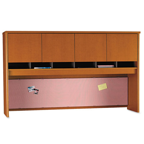 Series C 72W 4-Door Hutch for classic styling with clean lines and extended modesty panels. Mount the Hutch to the 72W Desk or Credenza Shell, Corner Modules and combined Lateral Files. Constructed with 100% thermally fused laminate for durability and superior resistance to scratches and stains. Includes six work-in-progress shelves and a closed storage compartment with self-closing, Euro-style hinges. Wire management grommets keep plugs and cables under control. Fully finished, fabric back panel with a Tackboard, plus works with two Task Lights (sold separately). Color: Hansen Cherry/Graphite Gray; Color Family: Cherry; Overall Width: 71.13"; Overall Depth: 15.38".