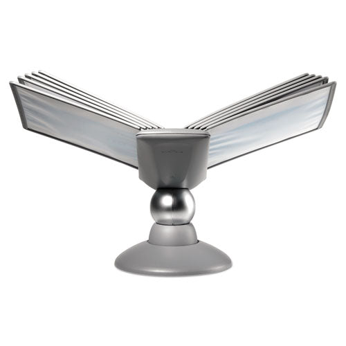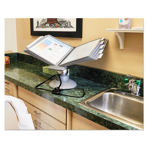 Elegant system rotates 360° and tilt adjusts between 25° and 70°. Sleeves open on two sides for easy paper insertion. "Paper Secure" corner clips hold pages safely in place and add a stylish design accent. Glare-free, polypropylene sleeves with rugged frames. Not expandable. Includes swiveling and tilting desk stand, 10 sleeves and 10 snap-on tabs. Gray Borders. Rack Style: Rotary; Literature Display; Sheet Capacity: 20; Number of Compartments: 10; Compartment Types: Double-Sided Letter.