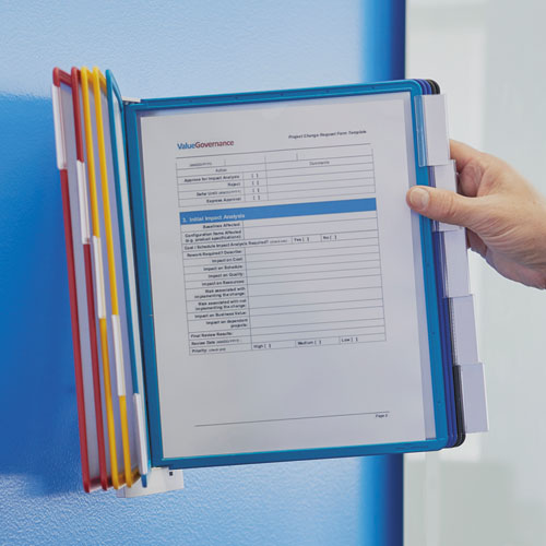Angled wall bracket to keep sleeves open. Expand by adding systems side by side. Glare-free, polypropylene sleeves with rugged frames for heavy use. Includes wall bracket with mounting hardware and template, sleeves and snap-on tabs. Assorted Borders—Two each black, blue, green, red and yellow. Rack Style: Reference; Material(s): Polypropylene; Sheet Capacity: 20; Number of Compartments: 10.