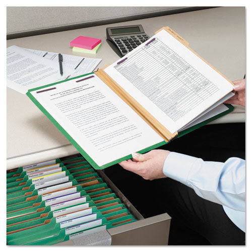 The ultimate classification folder when safety and security are most important. SafeSHIELD® bonded fasteners add protection for papers and fingers, while also reducing fastener crinkling. Made of pressboard for extra durability. Variety of colors for color-coding projects. Folder Size: Letter; Total Number of Dividers: 2; Total Number of Fasteners: 6; Max Folder Expansion: 2".