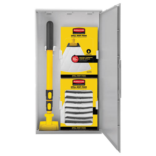 Mountable and compact mop storage cabinet. This mop cabinet can hold one spill mop handle and up to two packs of spill mop pads or 20 biohazard spill mop pads, (all sold separately). Can be mounted on most wall surfaces for quick and convenient access in the event of spills. Includes hardware kit for mounting. Height: 27.5"; Width: 15"; Depth: 6"; Color(s): Gray.