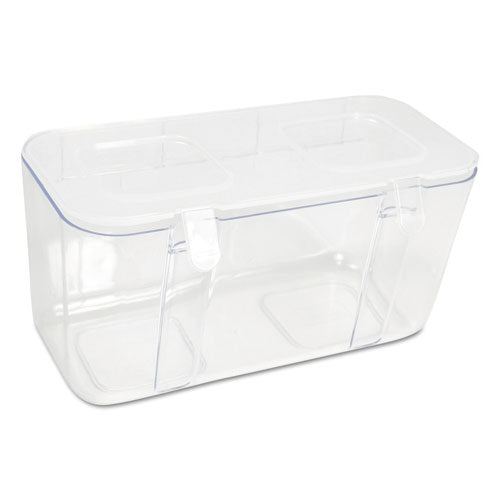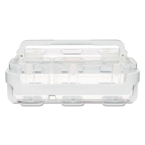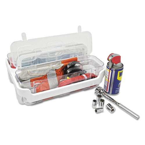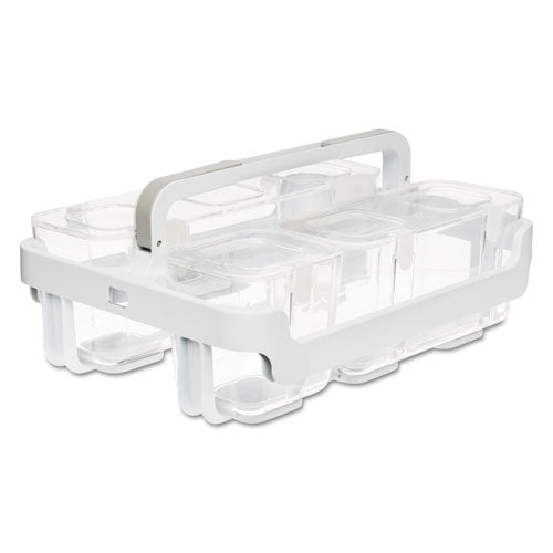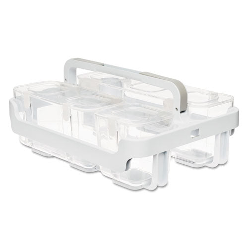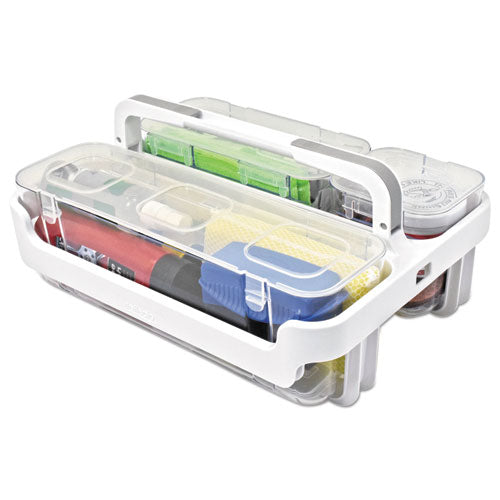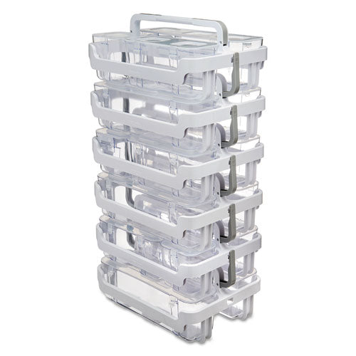 Essential for bringing supplies with you, or organizing a small space. Stack and carry multiple caddies with the “lift & lock” feature. Hinged snap-tight lids keep contents secure and are easy to remove when you’re ready to work. Clear storage containers let you see items easily. Desktop Supplies Organizer Type: Stackable Caddy; Number of Compartments: 3; Overall Width: 10 1/2"; Overall Depth: 14".