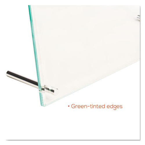 Sleek and sophisticated with glass-look green tinted edges and decorative silver post base. Slanted for easy viewing. Reposition base knobs to accommodate vertical or horizontal signage. Create professional looking signs in seconds from your own office with deflecto®'s free online SignCreator™ software—no download required. Frame Color: Clear w/Green Tinted Edges; Size: 10 1/16" x 3 3/8" x 12 5/8"; Message(s): Customizable; Insert Size: 8 1/2 x 11.