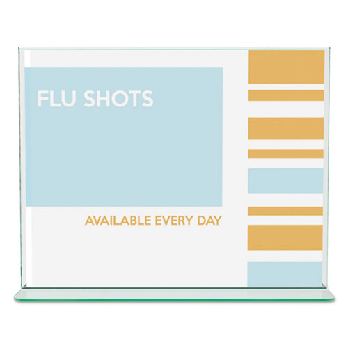 Green-tinted polished rounded edges provide a glass-look appearance and safe touch. Great for high-end signage, awards or certificates. Personalize and print signs from your own printer using deflecto®'s free online SignCreator™ software. Frame Color: Clear; Size: 11 1/16" x 3 11/32" x 8 3/4"; Message(s): Customizable; Insert Size: 11 x 8 1/2.