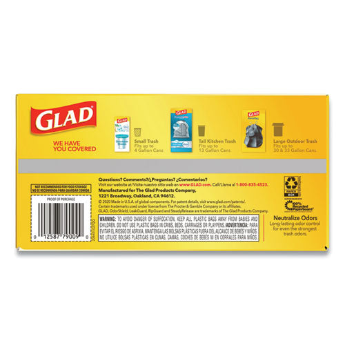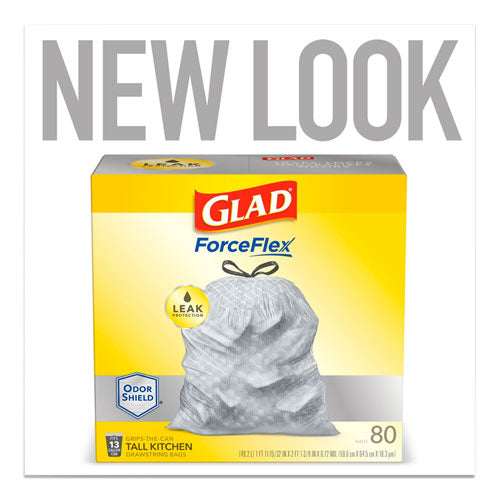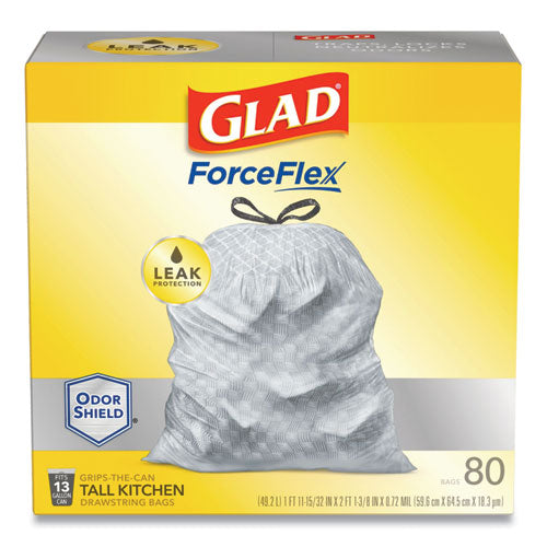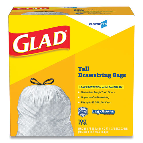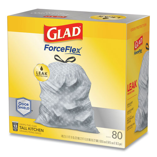 Glad Tall Kitchen Drawstring Trash Bags are designed with ForceFlex technology to give extra flex as it expands around sharp edges and heavy loads, so you can pack it in while resisting tears, rips and punctures. Let the stretchable strength of Glad handle all the messes our busy daily life can throw at it and then some. With double-sided seals and a reinforced bottom, these bags are designed with RipGuard and LeakGuard technology to prevent seepage of liquids and keep trash contained. The durable Grips-The-Can Drawstring ensures a tight grip on the trash can to keep it in place. Take the trash to the curb with no fear of leaks and tears, and no frustration. Keep your kitchen smelling clean with the stretchable strength of Glad. Ideal for use in offices, schools, daycare centers, restaurants, hotels and other commercial facilities.