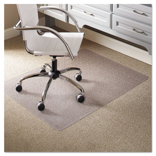 High-quality task chair mat is ideal for home and light office applications. Exclusive AnchorBar® cleats hold the mat firmly in place, yet are gentle on both your carpet and fingers. Straight edge. Flat to Low Pile Lip Mat—Ideal for light office applications. Protects low pile or commercial carpets up to 1/4" thick including padding. Mat Type: Chair Mat; Application: Carpet up to 0.25" thick (including padding); Width: 45"; Length: 53".