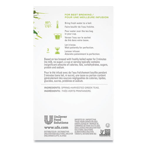 Choose your favorite from this variety of fine black, green and herbal teas. Each has an absolutely delicious flavor profile. Meticulously balanced, premium blends. Individually wrapped. Beverage Type: Tea; Flavor: China Green Tips; Packing Type: Filterbag; Capacity (Weight): 1.7 oz.