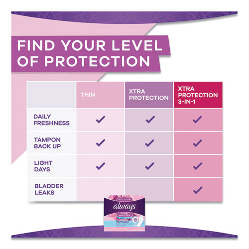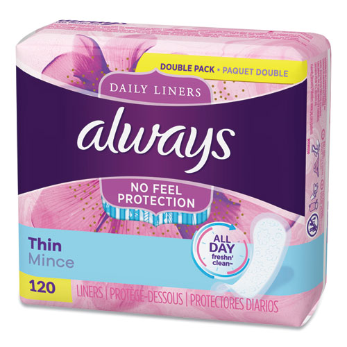 Convenient, flexible liners are thin and comfortable enough to wear every day. Designed with breathable layers that help keep moisture away and keep the wearer comfortable. Edge-to-edge adhesive holds the pantiliner in place, keeping it from shifting. Individually wrapped liners are a perfect fit for pockets and purses - take them on the go for peace of mind. Designed for seamless comfort - you may even forget you're wearing one. Ideal for an everyday clean feeling, light flow days and tampon backup. 120/Pack, 6 Packs/Carton. Absorbency: Regular.