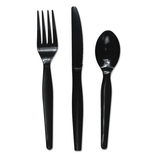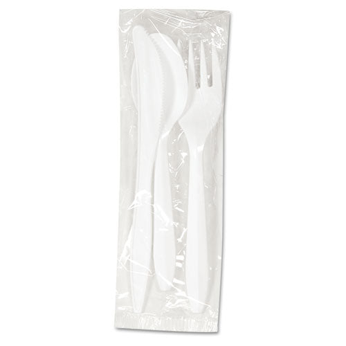 Serve any meal with this cutlery kit. Each pre-packaged wrapping contains a medium weight plastic fork, spoon and knife. Mediumweight. Utensils Type: Combo Set; Material(s): Polypropylene; Color(s): White; Grade: Medium weight.