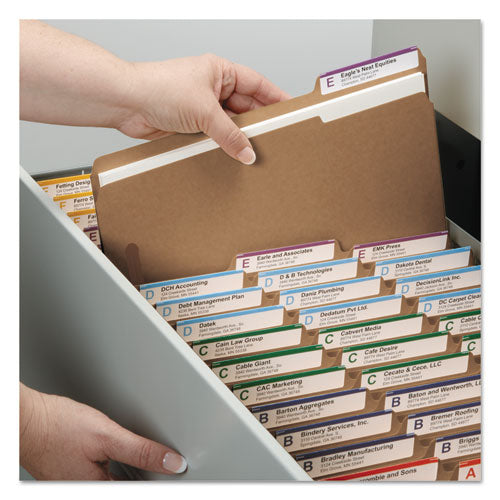 Hold papers securely and keep them in order with fasteners. Fasteners provide separate filing surfaces. Reinforced tabs for extra durability. 11 pt. Kraft—Two fasteners. File Folder Size Type: Letter; File Folder Color: Kraft; Color Family: Brown; File Folder Material: 11-pt Kraft.