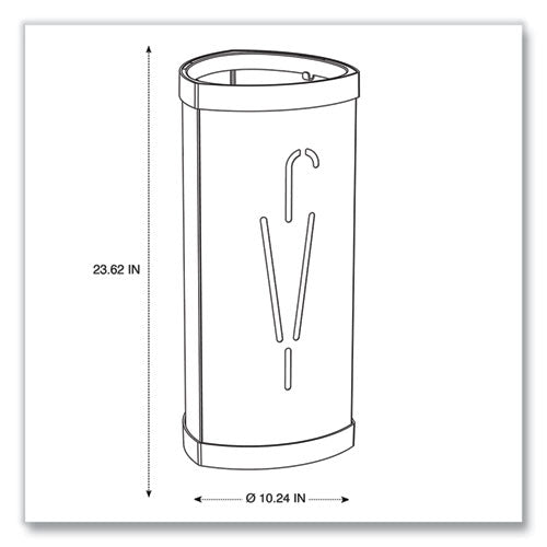 Triangular umbrella stand offers a large capacity, holds up to twelve umbrellas. Clever umbrella cut-out design on the sides provide excellent ventilation and speeds up drying time. Equipped with a water retainer. Three interior hooks to hang pocket umbrellas. No tools required for assembly. Mounting: Stand Alone; Width: 10.25"; Depth: 10.25"; Height: 23.67".